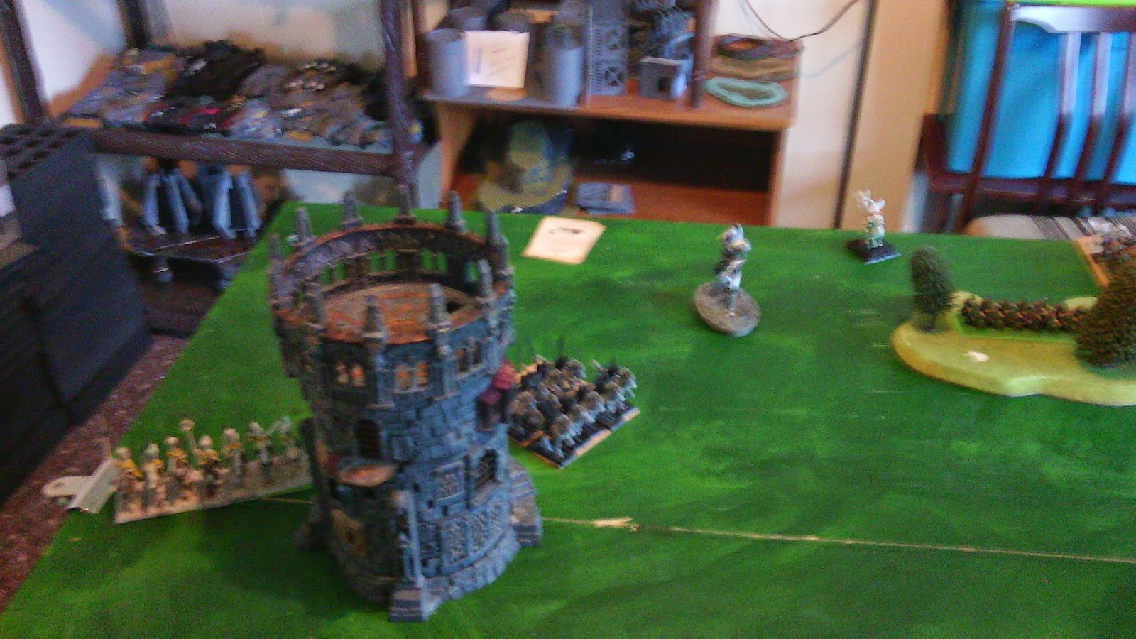 I deployed with a fairly strong middle, the skirmishers out to the left, my fast cavalry to the right. I unsuccessfully hid my treeman from the the skullcannon, but due to my drops he placed it after the Treeman. His turns were numbered. My vanguarding Sisters of the Thorn got nice and comfy by the wizards tower whilst my Wild Riders came round the other side ready to chase off any thieving Horrors. The Daemons set up was pretty much based on racial tolerance, the Khorne contingent being the only group who wouldn't mix with their allies. The great Unclean One squatted between a Tzeentch chariot and unit of Horrors. In my day there was a thing called daemonic hatred where that sort of thing just wasn't done!