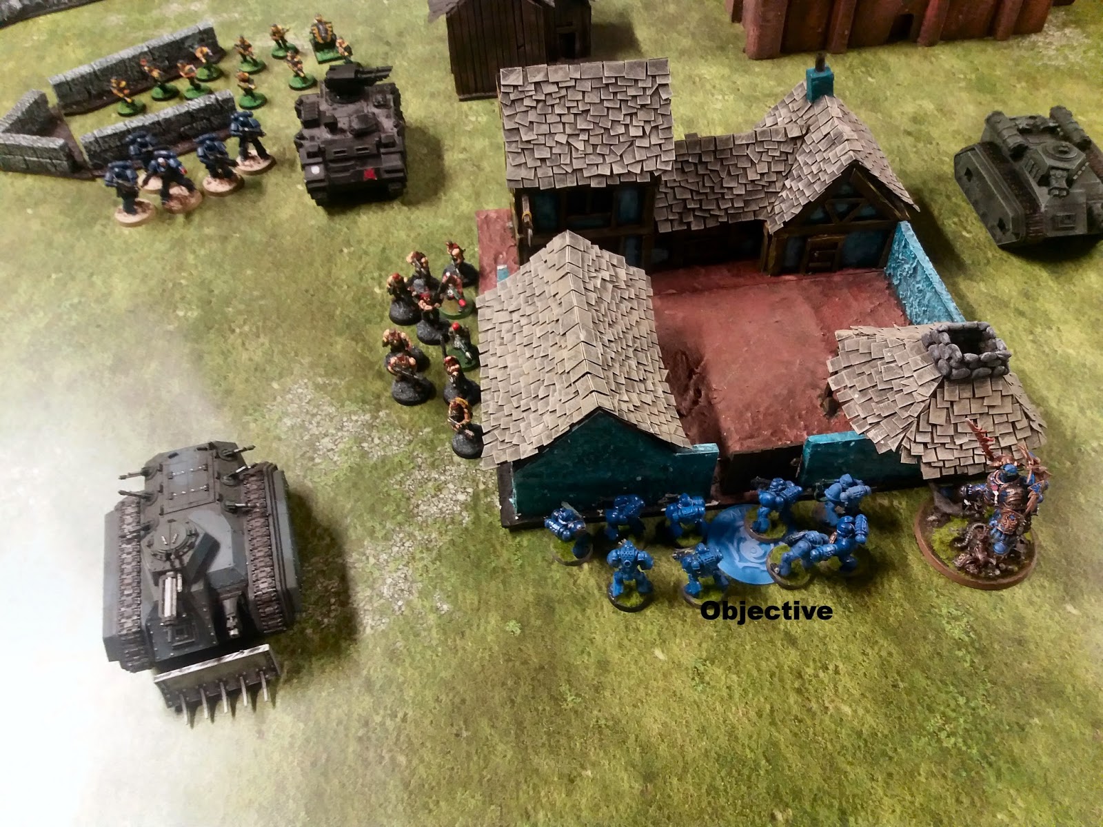 As games go, this was extremely close. For my first outing with the new Codex, it went ok, I threw away a couple of units and wasted others (most importantly the Cadians who did absolutely nothing all game). The Laurels of Command were meh, as I failed a couple of times to get the 4+ extra order. If I had a vox then I could have stolen the Ultramarines objective at the end. The Ratlings survived the battle which is a first, so Nightshroud is a useful Wyrd power. First time I used the Veterans and got them wiped out to a man. I like them and I'll probably use them again. A big plus for me was the Catachan vehicle doctrine that allows a reroll on random numbers of shots, quite a few times the tanks went from a 1 to a 5 or 6. This was the main reason the Hellhound killed the ultramarine by the inn, I got 10 or 11 hits I think.Not getting the first turn was unpleasant especially as the Centurions are absolutely lethal next to Gullimann. I think Aaron forgetting his Ghostkeel could just fly out of combat helped us, and a squad of Primaris Marines did a little bit more than my Cadians. The Razorback would probably have done more if it was over next to our objective. All in all a fun game where I learned quite a bit more about my army.