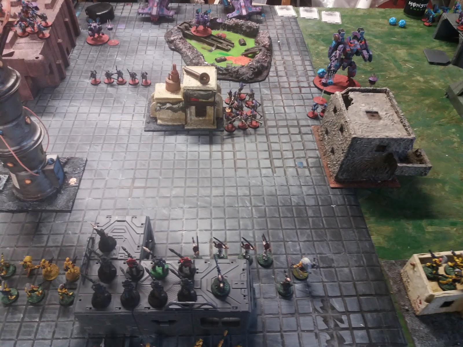 Aaron got first turn and proceeded to get all shooty. He targeted my Jetbikes and Rangers mainly, so at the end of the shooting phase the Rangers on objective 5 (the tall comms tower) were gone as were both the unit of jetbikes. This puts a crimp in my plan as I like to get twin shuriken catapults into my enemies faces. The only upside to this was most of my other units were pretty much unscathed. So Aaron get first blood, curses! Not entirely a shock as the Tau are very shooty.
